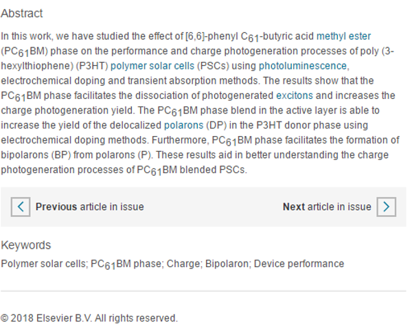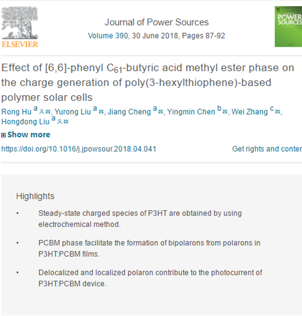 近日,我院胡荣博士研究团队在爱思唯尔(Elsevier)旗下的国际著名能源类期刊Journal of Power Sources(2017年影响因子6.945,JCR. SCI一区期刊)发表了研究论文“Effect of [6,6]-phenyl C61-butyric acid methyl ester phase on the charge generation of poly(3-hexylthiophene)-based polymer solar cells”,该工作由新材料技术研究院胡荣博士(第一作者)、柳红东博士(通讯作者)等人负责完成,并得到广州大学张伟副教授在数据分析方面的支持。