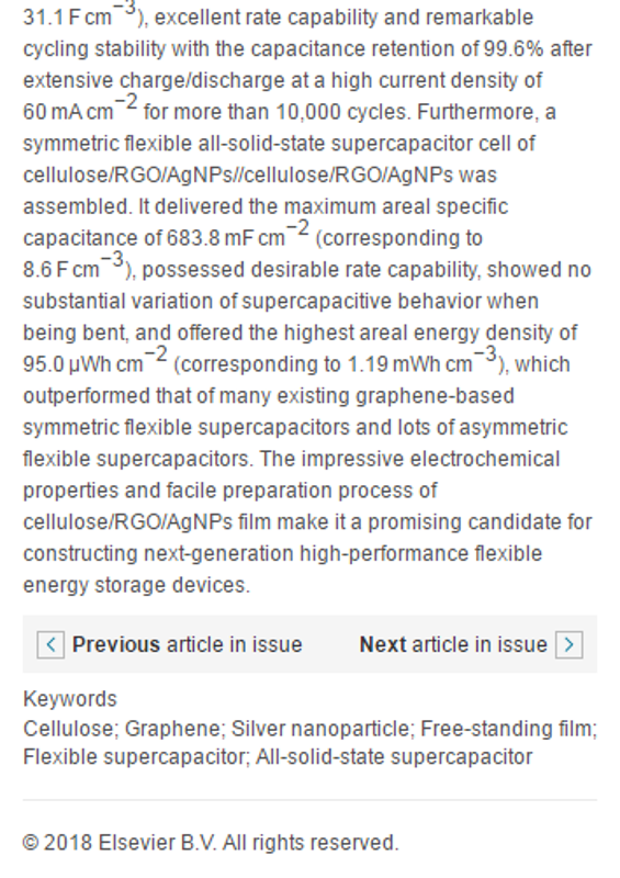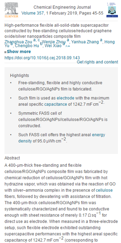 近日,我院肖巍副教授团队在全固态柔性超级电容领域取得最新进展,并在爱思维尔(Elsevier)旗下的著名化工类期刊《Chemical Engineering Journal》(2017年影响因子6.735,JCR,SCI一区期刊)发表了研究论文“High-performance flexible all-solid-state supercapacitor constructed by free-standing cellulose/reduced graphene oxide/silver nanoparticles composite film”,该工作由重庆文理学院与重庆理工大学联合培养的硕士研究生邹章华(第一作者)在其导师肖巍博士(通讯作者)的指导下完成。