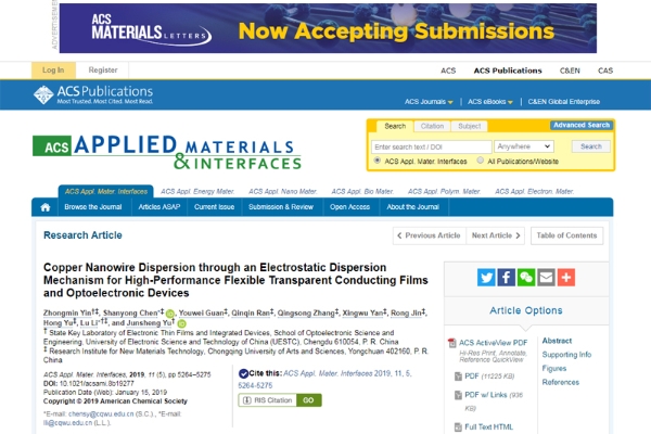 近期,我院新材料技术研究院李璐教授团队在光电薄膜材料与器件研究领域取得重要进展:现阶段承担的金属纳米线薄膜、织物压力传感器和光电能源转换器件3个研究课题齐头并进,成绩斐然。最新3项研究成果分别发表于国际顶尖期刊ACS Applied Materials & Interfaces(影响因子8.097,JCR一区)、Journal of Materials Chemistry C(影响因子5.976,JCR一区)和Solar RRL(即时影响因子6.724,Advanced Materials姊妹刊),其中2篇被编辑选用为封面/插图,受到同行广泛关注。