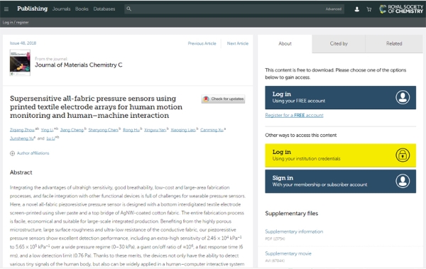 该论文通过丝网印刷织物电极与银纳米线包裹导电织物相结合的办法成功组装了大面积全织物压力传感器阵列。传感器单元在0至30kpa的压力范围内获得了超高的灵敏度(2.46 ×104 kPa-1-5.65×105 kPa-1),高开关比(106),快响应(6ms)和低检测限(0.76 Pa)。传感器性能达到了国际同类器件的最好水平,目前与重庆京东方智慧电子系统有限公司合作进行开展应用技术研究,有望成为应用广泛的可穿戴电子元器件。