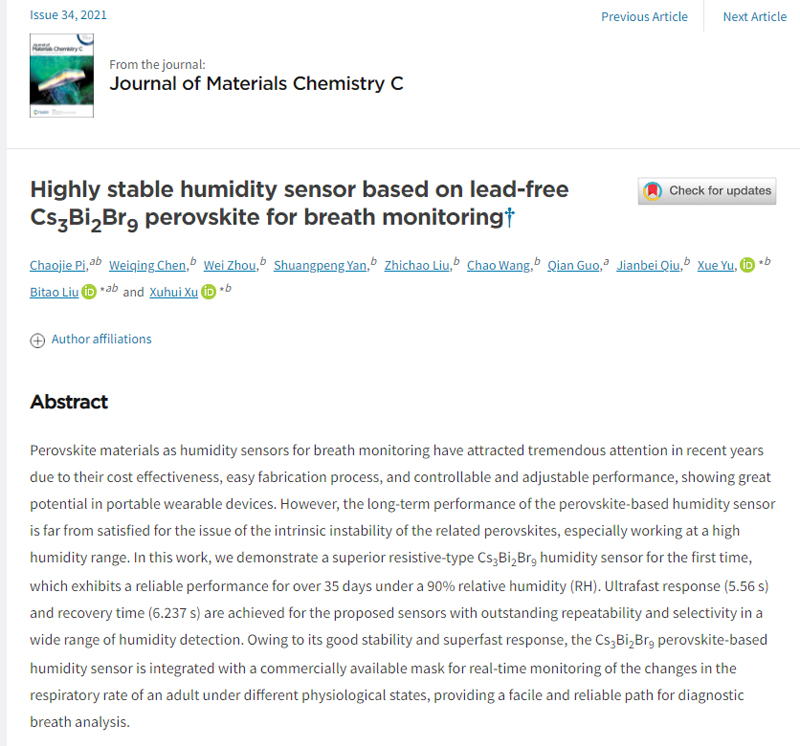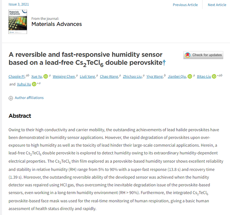 团队围绕痕量水检测与呼吸监控方面开展研究,提出采用无铅钙钛矿Cs3Bi2Br9、Cs2TeCl6来设计高稳定性和可重复使用的可视化传感检测技术,通过对材料表面钝化和物相结构转变过程来实现光电性能转变的调控,为基于钙钛矿的可视化传感器器件设计提供了新的思路。相关研究以“Highly stable humidity sensor based on lead-free Cs3Bi2Br9 perovskite for breath monitoring”和“A reversible and fast-responsive humidity sensor based on a lead-free Cs2TeCl6 double perovskite”分别发表在英国皇家化学会(RSC)旗下的国际著名材料类期刊《Journal of materials chemistry C》(IF= 7.393,一区TOP期刊)和《Materials Advances》(新出期刊)上。