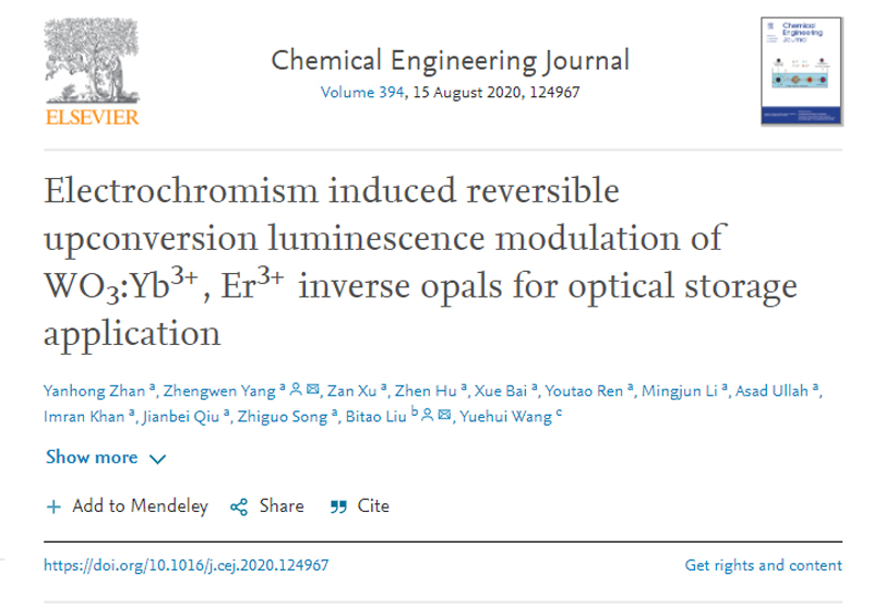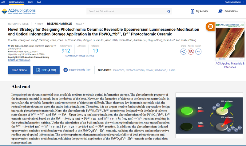 此外,团队围绕稀土荧光技术开展系列研究,开发了PbWO4:Yb3+,Er3+,WO3:Yb3+,Er3+,WO3系列光信息存储材料,该技术具有难仿制、准确率高的特点,有望推广成为新一代信息传感加密技术。相关成果发表在《Chemical Engineering Journal》(IF=13.273,一区TOP期刊)、《ACS Applied Materials & Interfaces》(IF=9.229,一区TOP期刊)、《Advanced Materials Technologies》(IF=7.848,一区TOP期刊)上。相关工作得到了国家自科基金(12064022)、中国博士后基金(2019M663575)、重庆市高校微纳半导体光子材料创新群体基金等的支持。