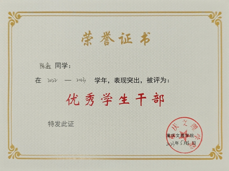9.2023年,获重庆文理学院优秀学生干部;