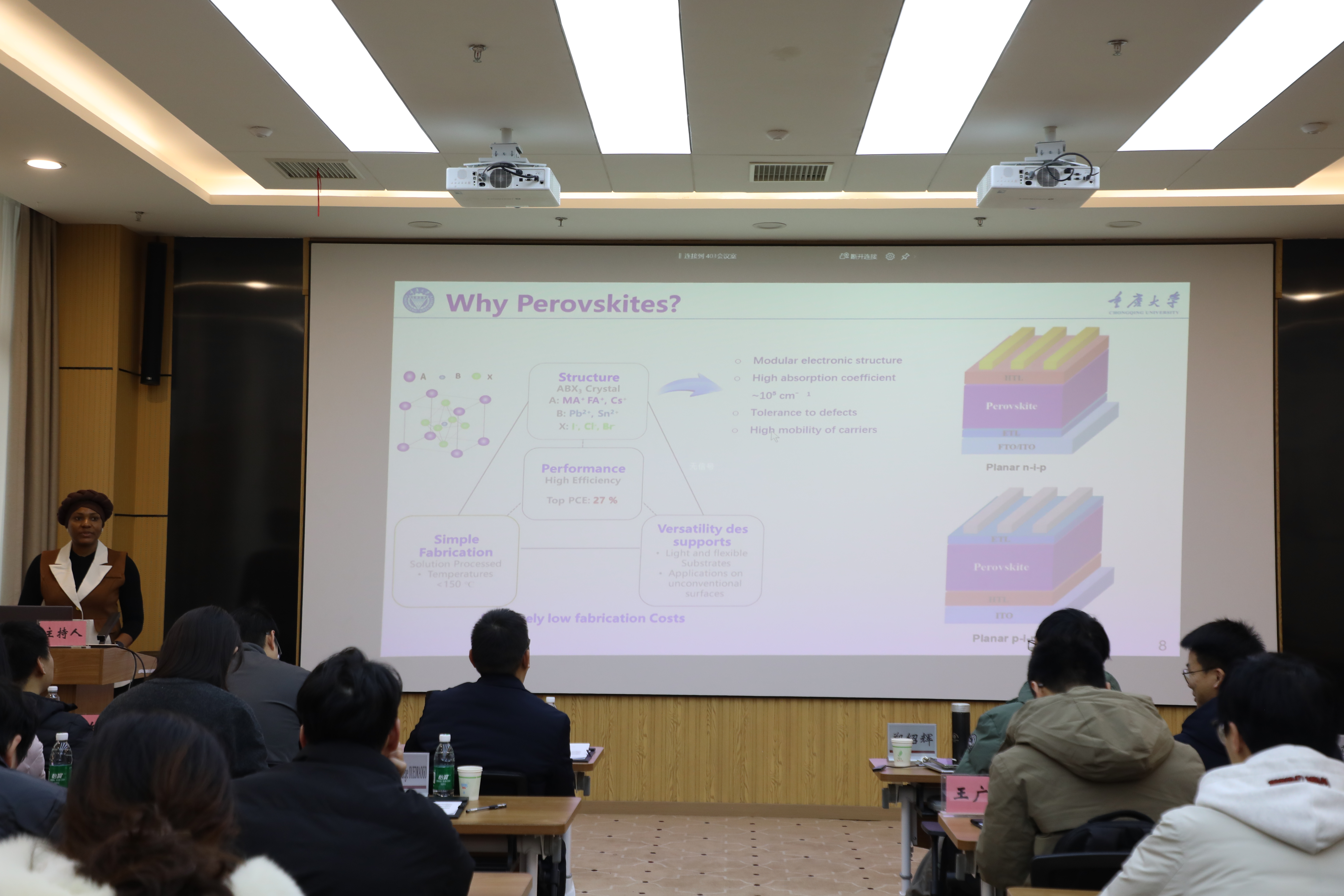 在主题报告环节,来自各高校的青年学者先后分享了最新研究成果。重庆大学高琴以“钙钛矿太阳能电池中钙钛矿薄膜结晶调控及其表面改性”为题,深入剖析了相关薄膜制备的关键技术;西南大学郑绍辉、雷衍连分别围绕机器学习预测光学带隙、近红外可视化探测等跨学科方向作了精彩报告;重庆师范大学唐燕、重庆理工大学胡忠利则从纳米复合结构设计、有机电极材料研发等角度,展示了技术应用方面的最新进展。报告内容兼具学术深度与实践价值,现场讨论气氛热烈。